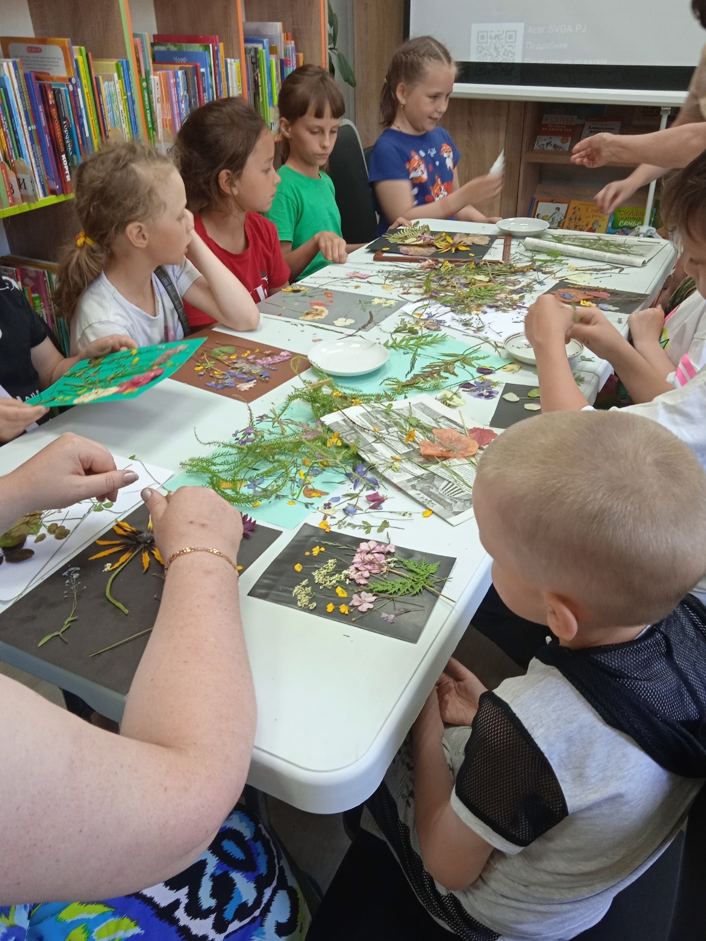 Таким образом, ответ был найден! Всем захотелось быстрее приступить к работе! На этом этапе ребятам на помощь пришла Дарья Алексеева. Вместе с Ниной Михайловной они подготовили заготовки из сухих растений для творчества, рассказали о том, как правильно сушить растения для создания композиций, а также о том, что такое гербарий. Участники встречи смогли попробовать свои силы в создании картин из сухих цветов и листьев. Взрослые помогали ребятам воплотить свои фантазии.