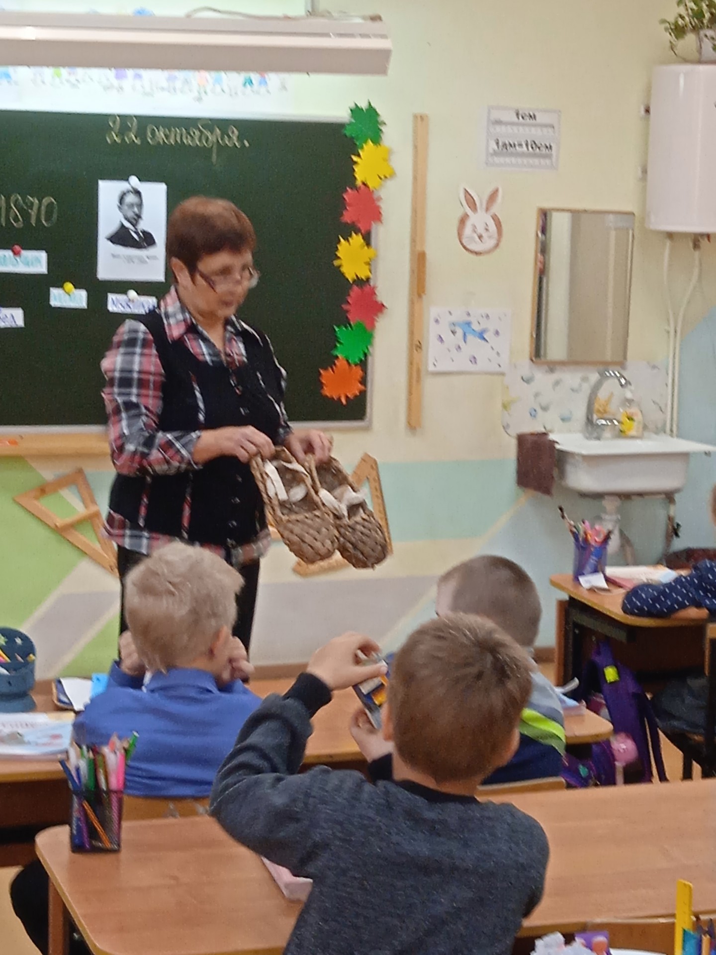 Нина Михайловна попросила детей угадать название рассказа, о котором речь пойдёт дальше. Подсказкой стал предмет, который неожиданно появился на столе — лапти.
