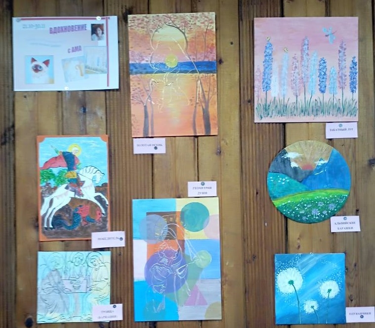 В начале 2025 года библиотекарь предложила участницам попробовать создать интерьерные картины. Все учились методом проб и ошибок, и нужно отметить, что у всех получалось довольно хорошо. Вдохновленная процессом, Мария Алексеевна создала свои шедевры, которые теперь украшают выставку «Вдохновение». Приглашаем всех посетить эту творческую экспозицию.
