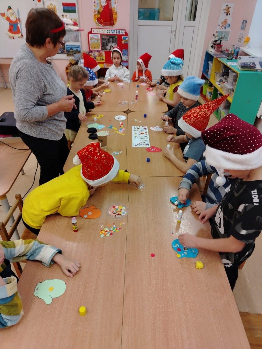 Ну и как в день рождения без подарка! Мы предложили ребятам украсить рукавички для Дедушки!