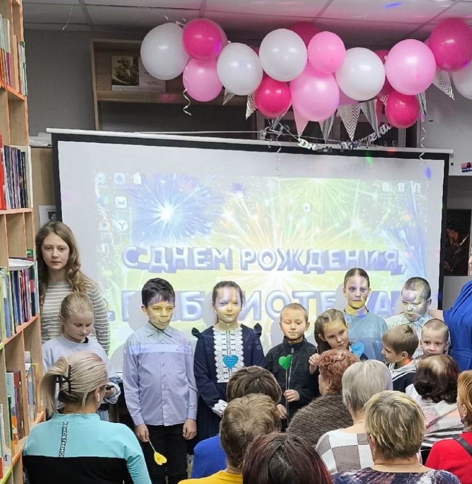 Через несколько минут праздник переместился в уютный зал библиотеки. Здесь звучали выступления детей и взрослых. Юные читатели декламировали стихи о книгах и чтении, взрослые исполняли частушки и песни, все присутствующие украсили юбилейный торт разноцветными сердечками, что стало приятным сюрпризом!