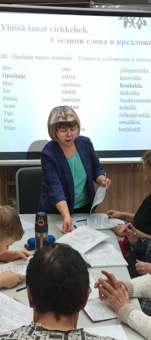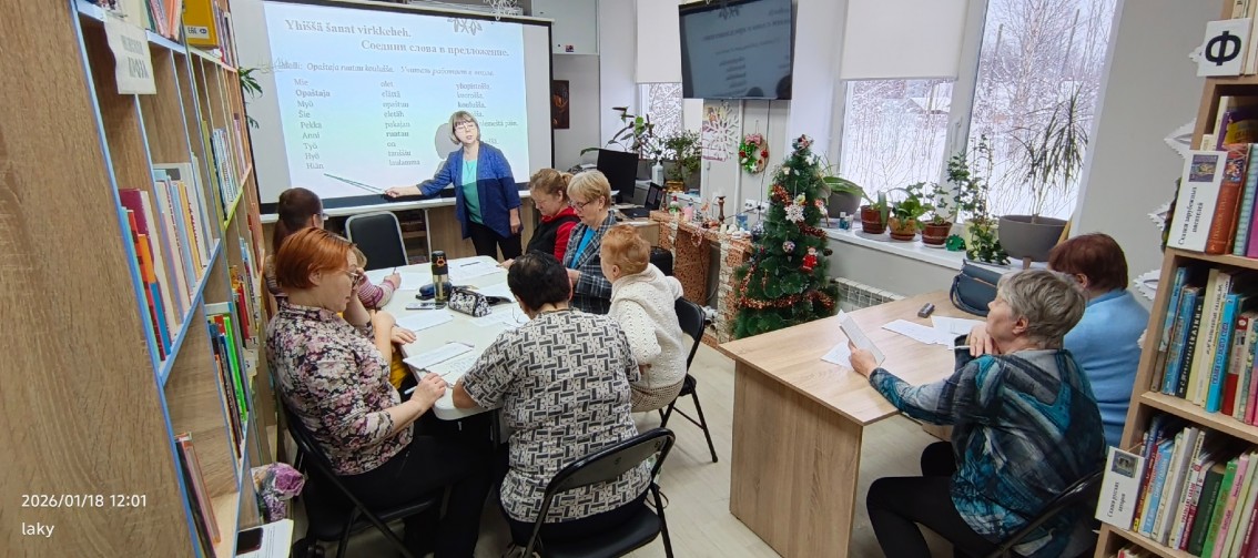 После длинных каникул обе языковые группы принялись за дело. Начали с рождественской песни "В лесу родилась ёлочка" на карельском языке. Затем перешли к изучению числительных. Ох, уж непростое это дело! Но осилили. В группу с нуля пришла новая ученица - Сидорова Наталья. Когда-то в школе она изучала финский язык, а теперь захотела присоединиться к группе. Основная группа "Tule pakinoilla" работала с объемным текстом о семье и выполняла интересные задания. Радует, что занятия приносят всем курсантам удовольствие!