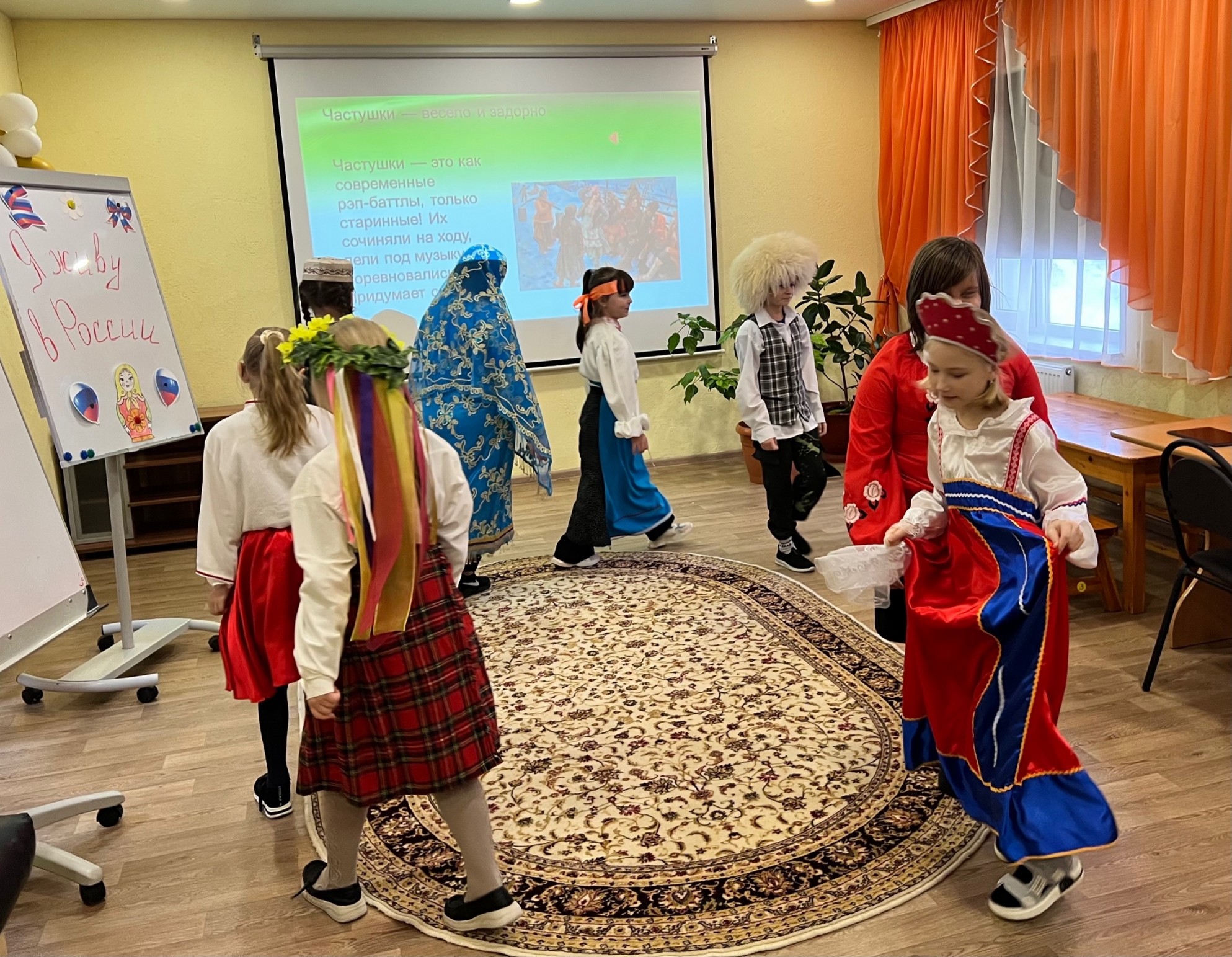 Встреча началась с небольшого путешествия в прошлое: библиотекарь рассказала детям, что такое фольклор, какие жанры он включает и какую роль устное народное творчество играло в жизни наших предков. Ребята узнали о: русских народных сказках — мудрых и поучительных; песнях и частушках — весёлых и задорных; пословицах и поговорках — коротких, но очень метких; загадках — хитрых и занимательных.